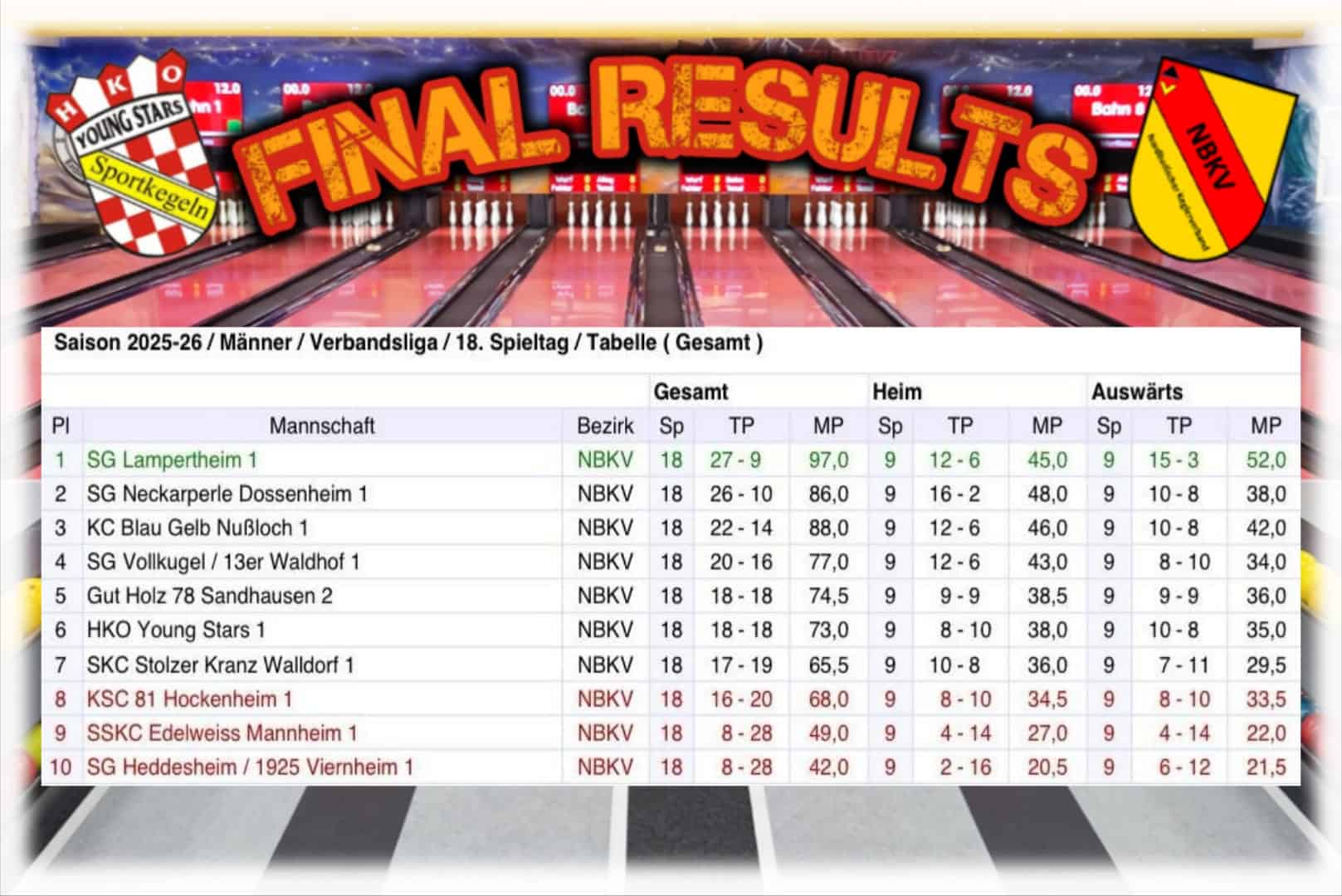 Die Saison 2025/2026 in der Verbandsliga Nordbaden, war unter dem Motto „Aufstieg“ gekennzeichnet, doch schnell merkte man, dass man nicht stabil genug ist, um ganz vorne mitzumischen. In der Hinrunde hatte man schon ein ausgeglichenes Punktekonto mit 9:9 Punkte und so manche Punkte liegen lassen. Die Rückrunde lief parallel zur Hinrunde, konnten jedoch drei mal einen der jeweiligen Tabellenführer in der Saison schlagen und sogar einen neuen Vereinsrekord mit 3.682 erzielen. Zum Ende der Saison mussten die Young Stars nochmals um den Klassenerhalt kämpfen, konnten diesen aber in einem packenden Finalspieltag (Young Stars 16:18 Punkte, Hockenheim 16:18 Punkte und Walldorf 15:19 Punkte vor dem letzten Spieltag) der Saison gegen den Meister der SG Lampertheim mit einem Heimsieg sichern. Am Ende landete man mit 18:18 Punkten auf einem 6. Tabellenplatz.