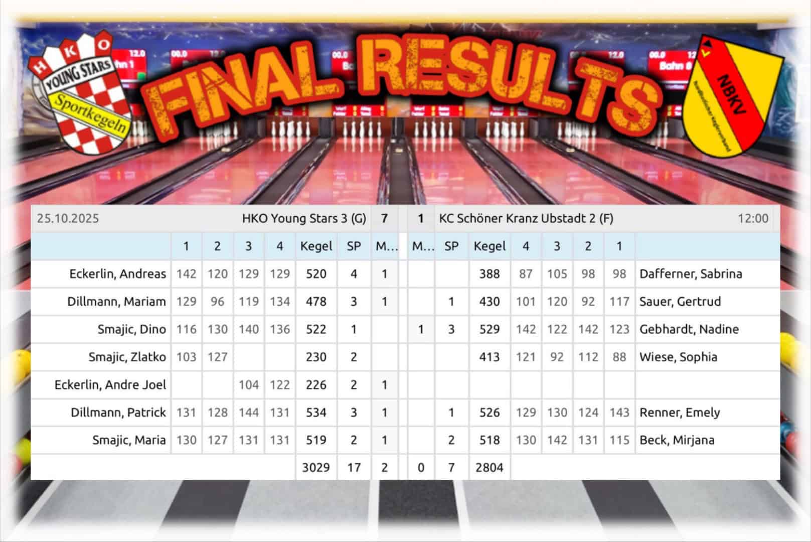 U-19 Spielerin MARIA machte es ein wenig spannender. Den ersten Durchgang gewann sie souverän. Den zweiten Durchgang verlor sie knapp mit 4 Kegel, holte sich aber die Führung im Dritten zurück. Der letzte Durchgang ein Kopf an Kopf Duell mit ihrer Gegnerin, welcher letztendlich MARIA mit einem Kegel und guten 519:518 Kegel gewann und den fünften MP für die Young Stars sicherte.