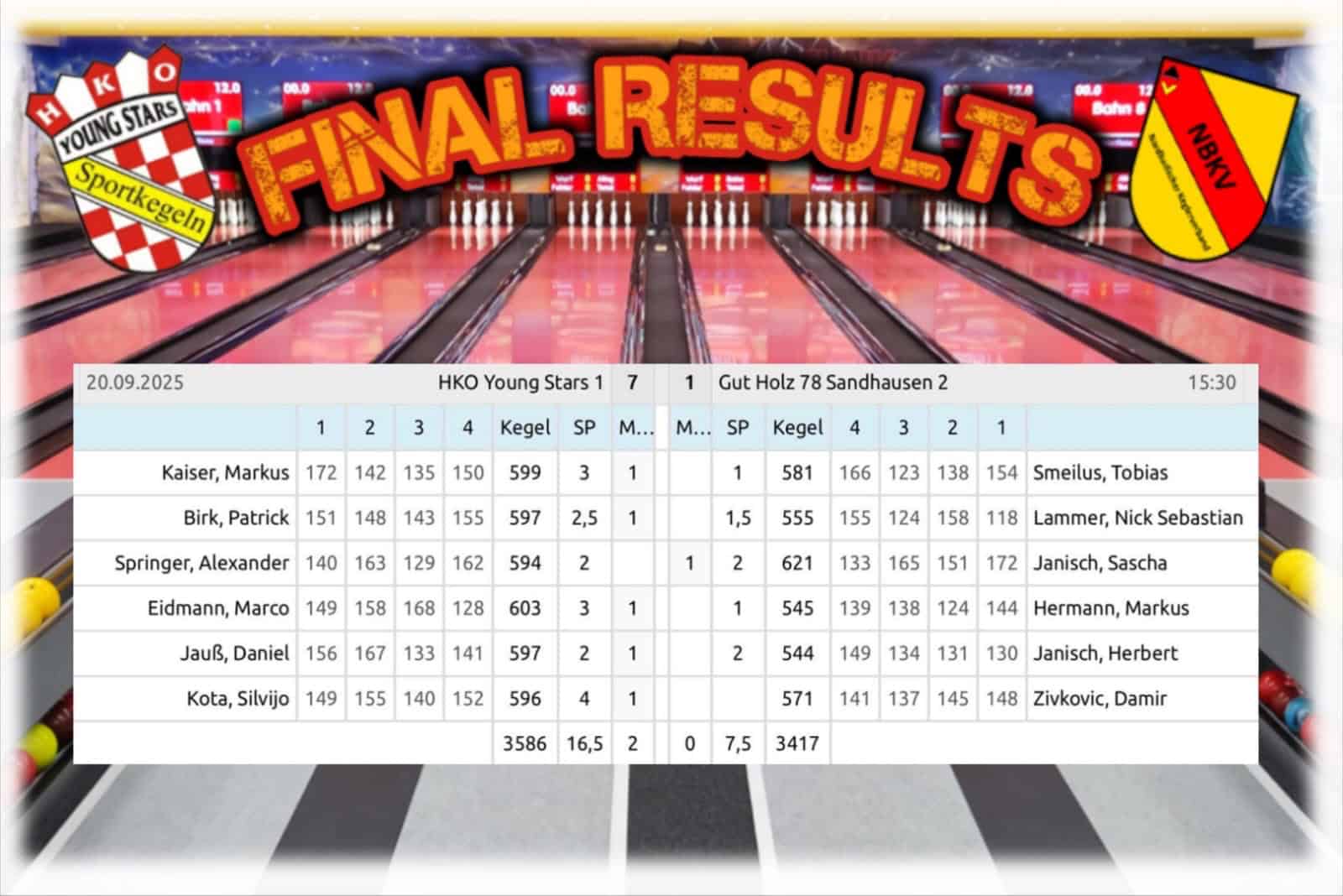 Das Spiel endete mit eindrucksvollen 3586 : 3417 Kegel und 7:1 MP.