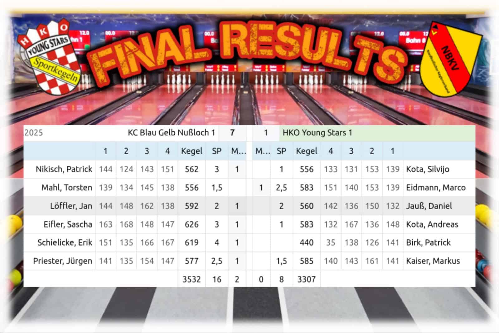 Somit stand die erste Saisonniederlage zu Buche. Mit 7:1 und 3532 : 3307 Kegel verlor man das Spiel. Durch die Niederlage rutschte man auf Tabellenplatz 3 ab. Mund abputzen und weiter gehts Männer!