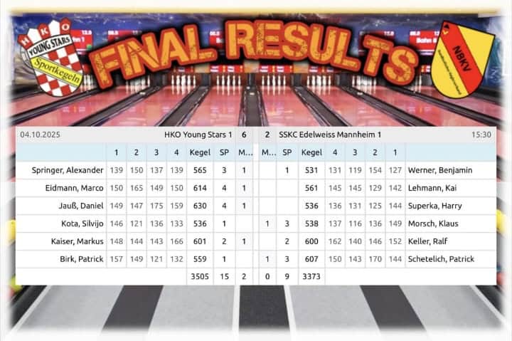 Das Spiel endete mit einem 6:2 Sieg und 3505 : 3373 Kegel. Durch den Sieg konnte Tabellenplatz 1 vorübergehend eingenommen werden.