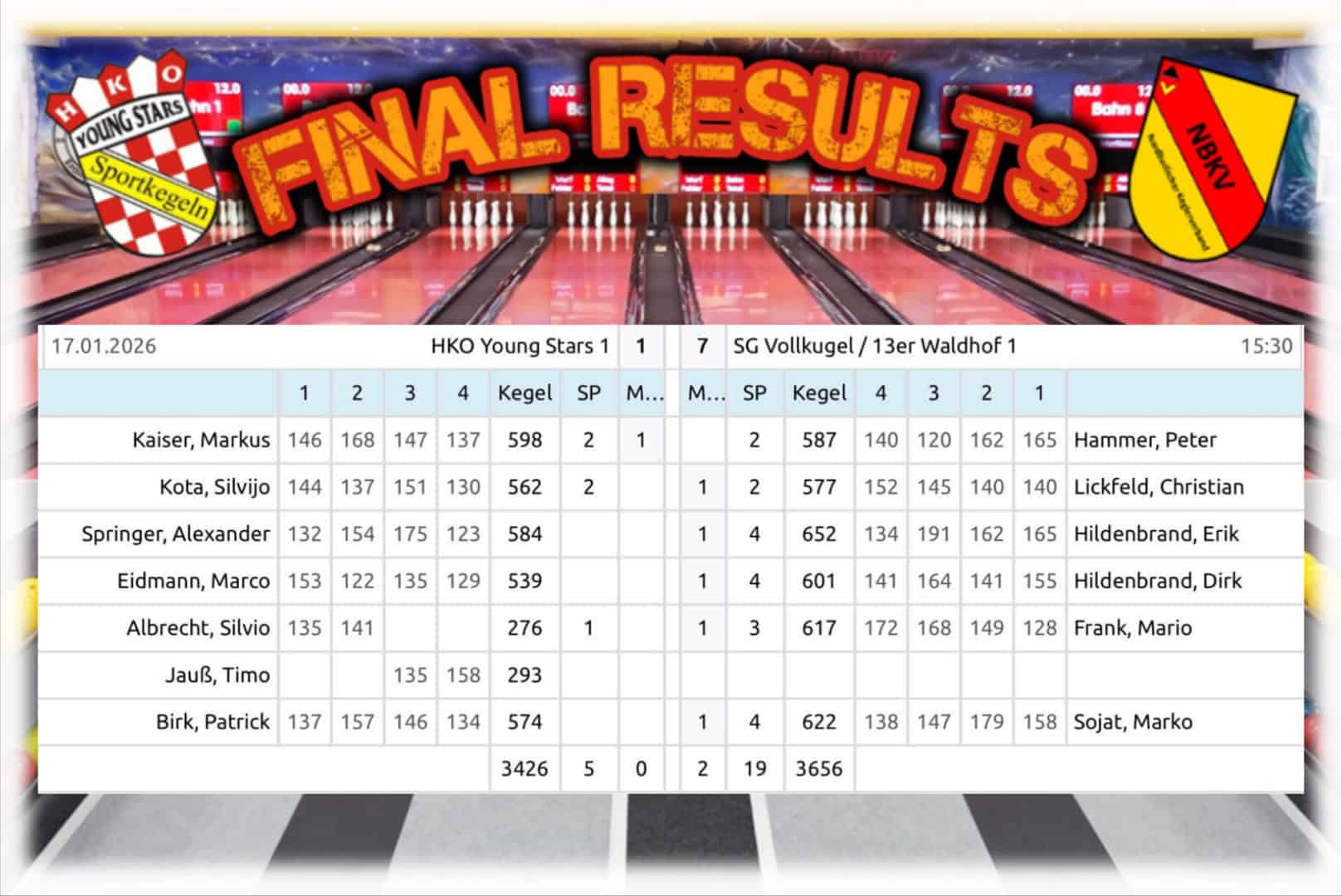 Den Schwung mitnehmen hieß es bei der Kabinenansprache von Kapitän PATRICK, startete das Jahr 2026 für die Young Stars doch positiv. Doch an diesem Samstag, erhielten wir von den Gästen aus Mannheim eine Lehrstunde. Mit der schwächsten Heimleistung gegen starke Waldhöfer hatte man an diesem Tag keine Chance. Eine 1:7 MP und 230 Kegel (3426:3656) Klatsche stand auf der Anzeigetafel.