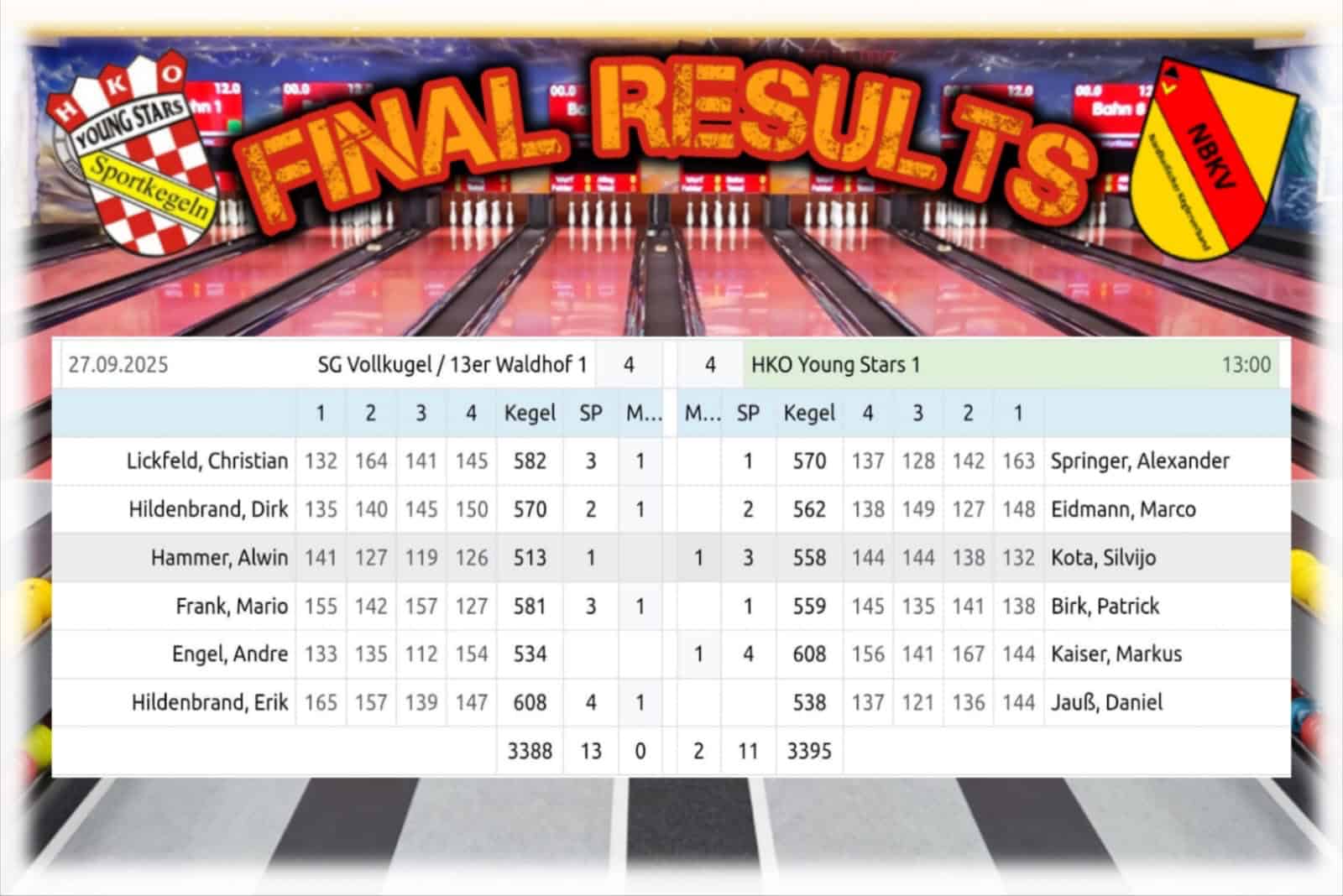 Das Spiel endete mit 3388:3395 Kegel. Ein gewonnener Punkt stand auf der Habenseite.