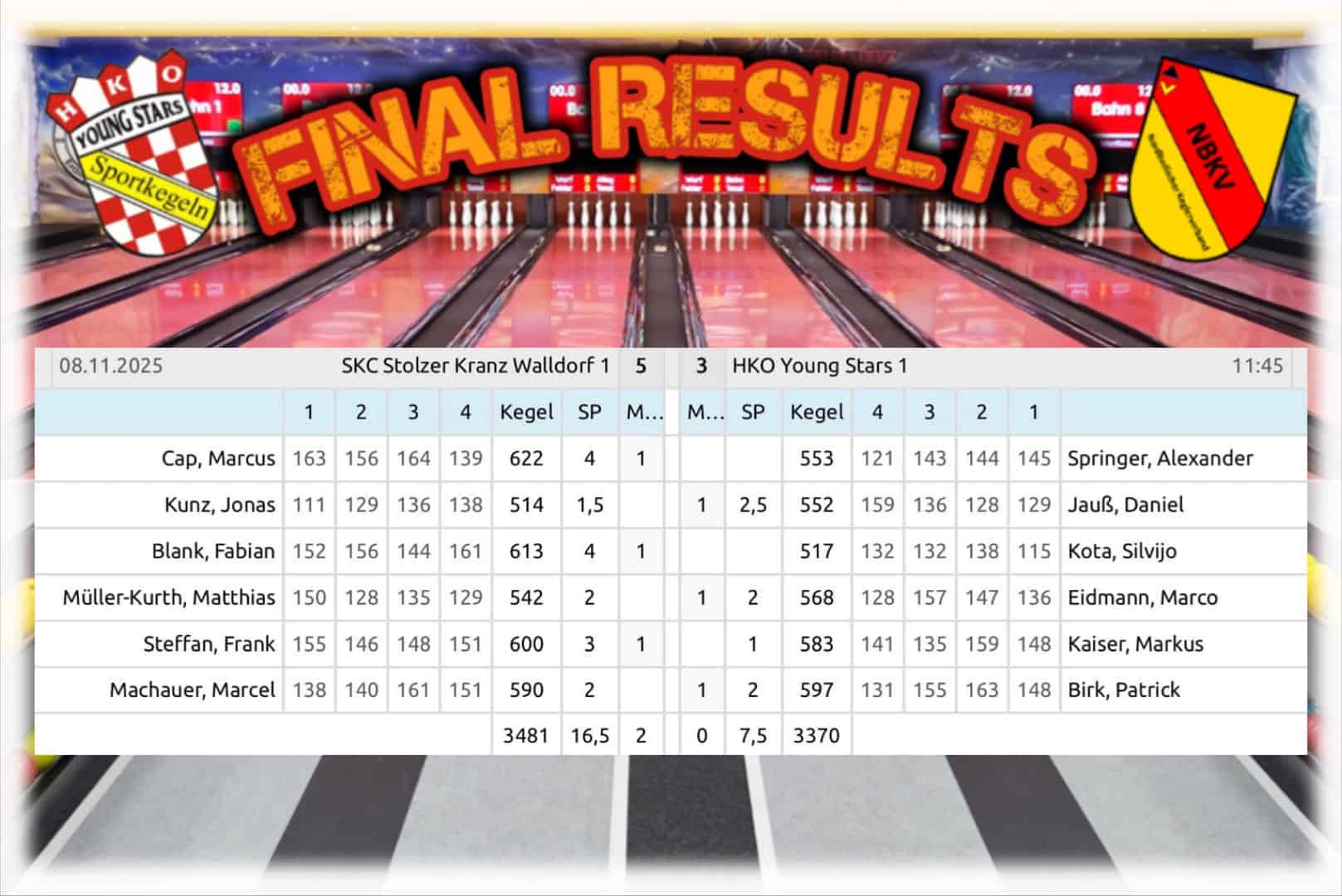 MARCO konnte dafür mit 2:2 SP und guten 568:542 Kegel den nächsten MP erspielen und paar Kegel zurückholen.
