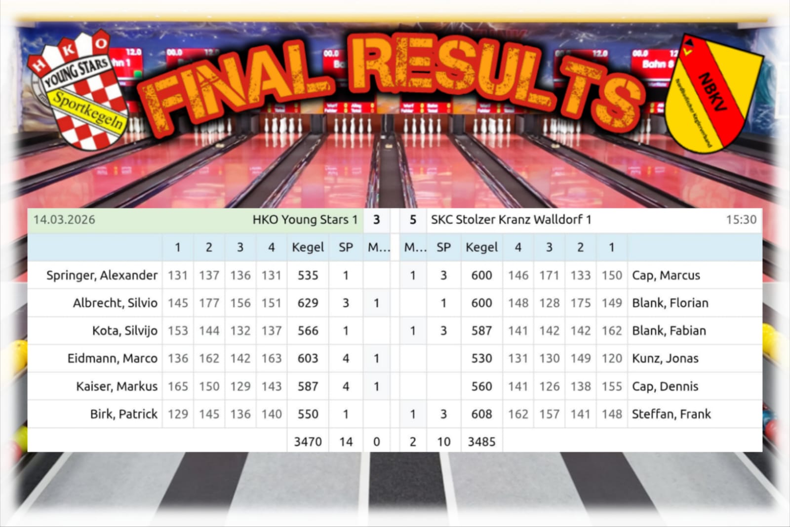 MARKUS begann mit starken 315 zur HĂ€lfte, hatte dann eine kleine SchwĂ€chephase im Spiel. Er holte dennoch mit 4:0 SP und guten 587:560 den MP. PATRICK tat sich anfangs sehr schwer und fand erst ab Durchgang zwei ins Spiel. Mit fĂŒr Ihn schwachen 550:608 verlor er sein Duell.