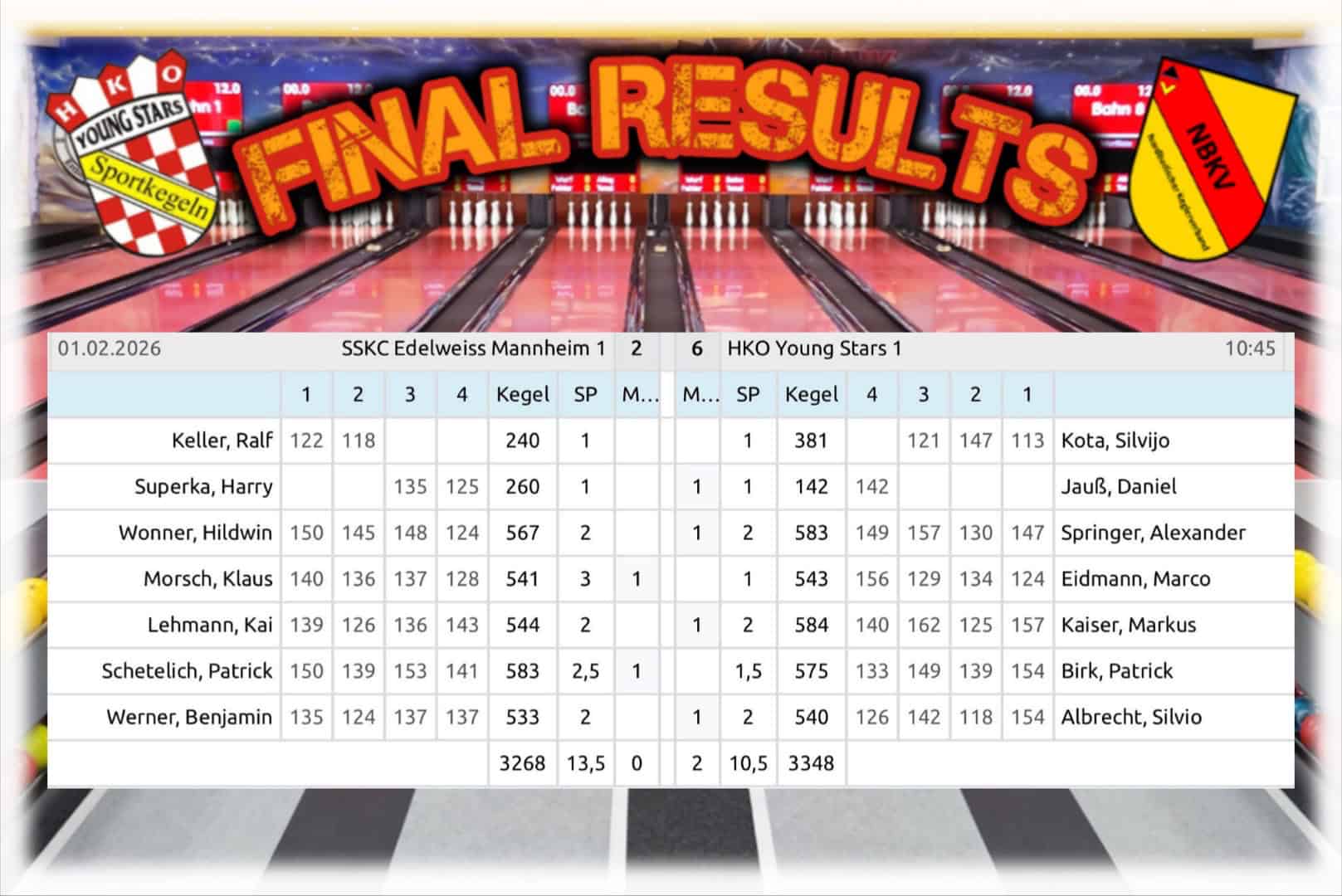 Zwischenstand 2:0 MP und 39 Kegel Vorsprung für die Young Stars.