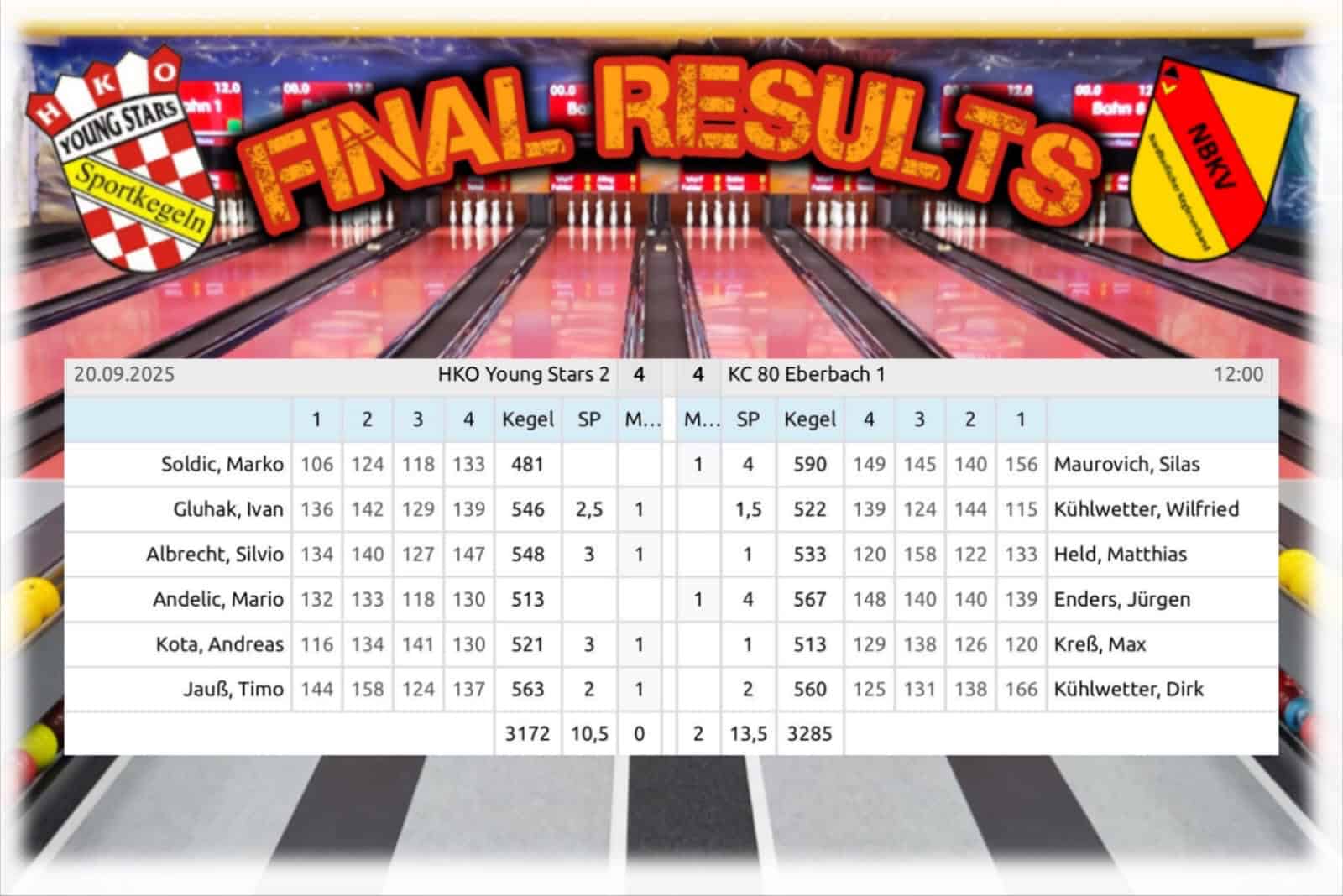 Am Ende holte man gegen einen guten Gegner verdient Zuhause noch ein Punkt. Das Spiel endete mit 4:4 MP und 3172 : 3285 Kegel.